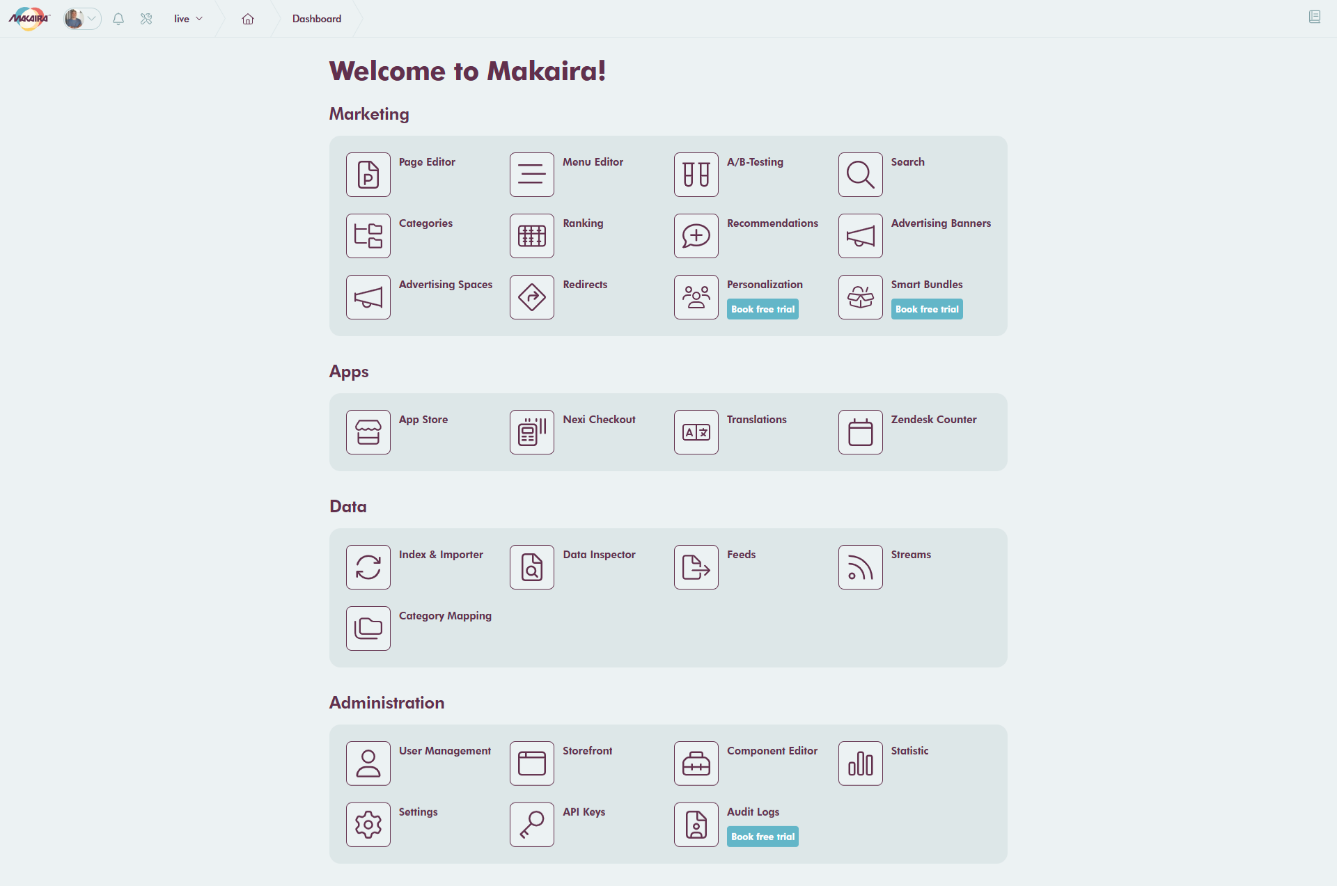 The Makaira Dashboard serves as the central control panel for navigating and managing the various applications and functionalities within the Makaira platform. It is organized into distinct sections, grouping related tools to provide a clear and intuitive user experience.